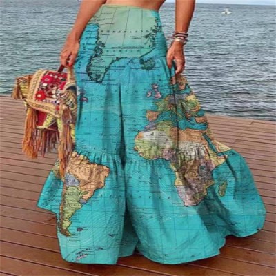 Summer High Waist World Map Long Skirt Women 3D Printing Tie-dye Vacation Skirts high plus size skirt