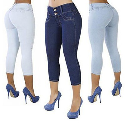 Women Sexy Casual Cropped Pants Solid Color Button Fly Waist Slim Trousers Breathable Elastic Pencil Pants