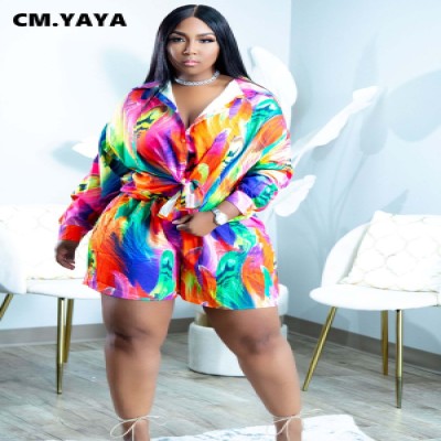 CM.YAYA Plus Size Elegant Tie Dye Holiday Women 2pcs Set Long Sleeve Shirt Shorts Set Tracksuit Two Piece Set Fitness Outfit