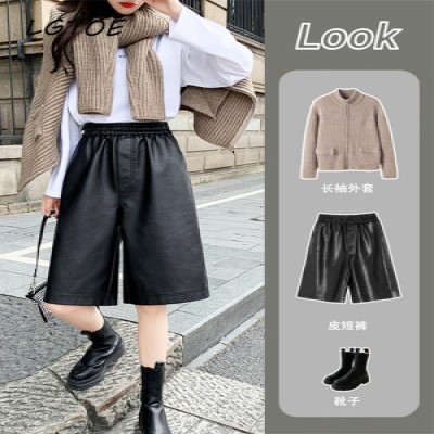 Black PU Leather Shorts Women Fall Winter Cotton High Waist Casual Knee Length Loose Shorts Ladies Y2k All-Match Pants