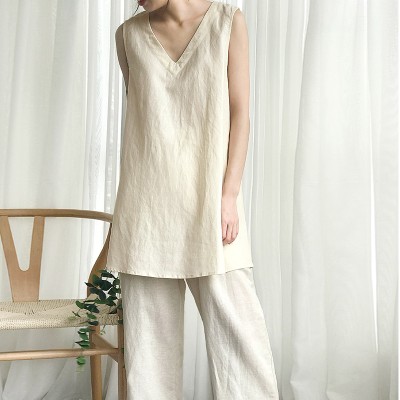 Linen V-neck Sleeveless Tank Tops Summer Women Solid Casual Loose Long Top Plus Size Woman Clothes