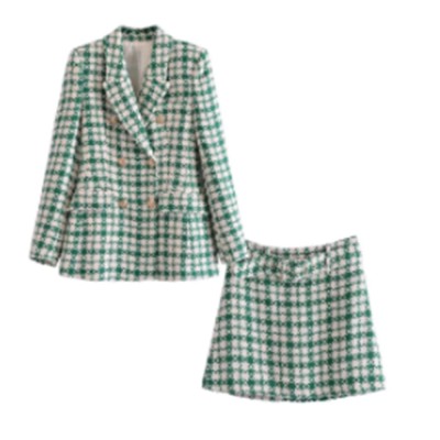 Blazer Women Lapel Double Breasted suit Top with Belted short Skirt Textured Plaid Print Set Fitted Elegant Female Clothing
