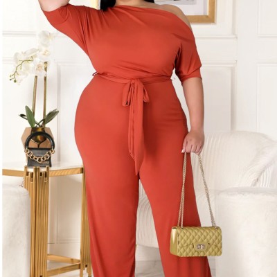 plus size women's solid color bandage slanted shoulder flared jumpsuit solid color casual suitable for friends party set