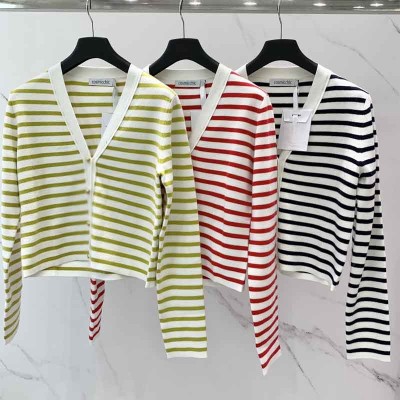 22 Silk Wool V-neck Striped Cardigans Gold Single Breasted Long Sleeve Sweater Temperament Women Loose Tops 3color