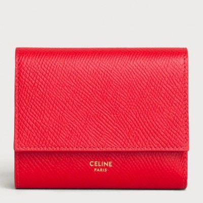 Celine Small Trifold Wallet in Red Grained Calfskin