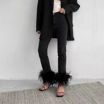 Spring Black Feather Denim Jeans Women Long Casual Straight Pants Elegant Office Lady Trousers Female