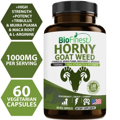 Biofinest Horny Goat Weed Extract 1000mg - Maca Root, Tribulus, Muira Puama, L-Arginine, Icariins - Gluten-Free Non-GMO - Men Women Supplements For Healthy Stamina Energy Muscle Workout Testo Booster