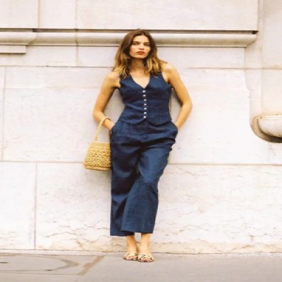 Spring and Autumn Linen Solid Color Single-breasted V-neck Sleeveless Women Casual Short Vest Jacket Trousers Suit